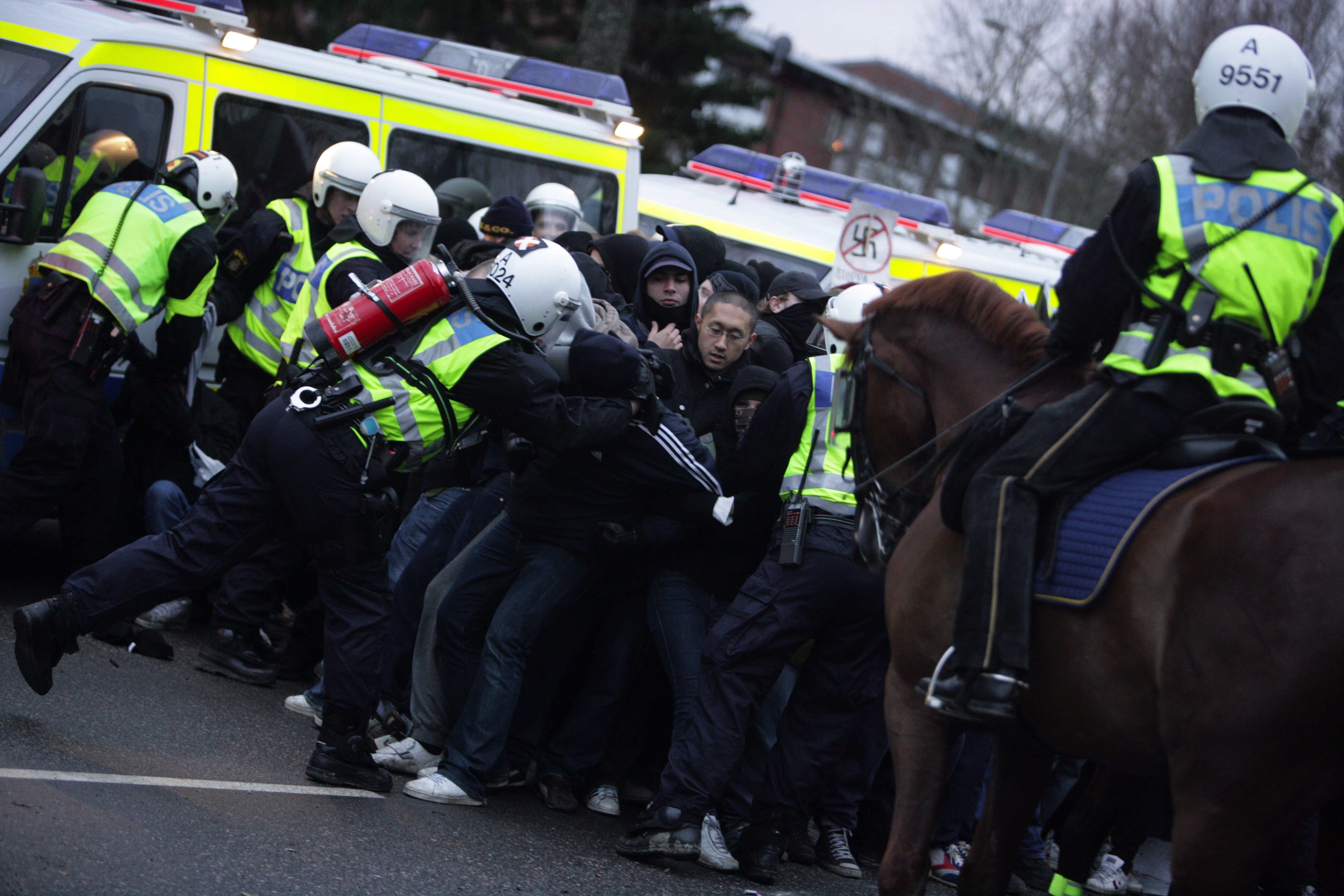 • 2008 var det 600 poliser som frihetsberövade flera hundra personer för att hålla isär grupperna. Notan blev fyra miljoner kronor.