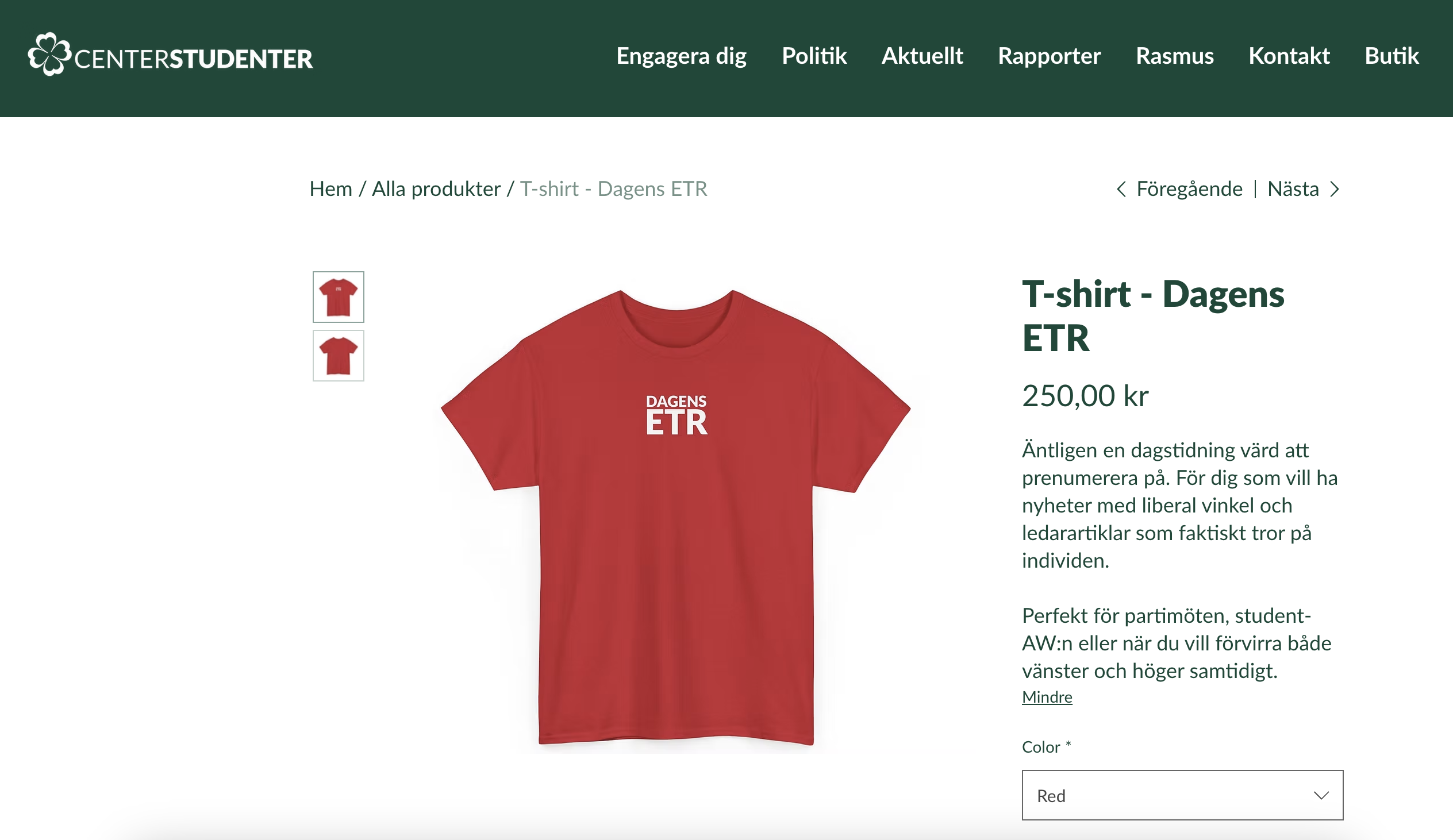 En nny produkt i Centerstudenters webbshop: en röd t-shirt med texten ”Dagens ETR”, formgiven likt logotypen för Dagens ETC.