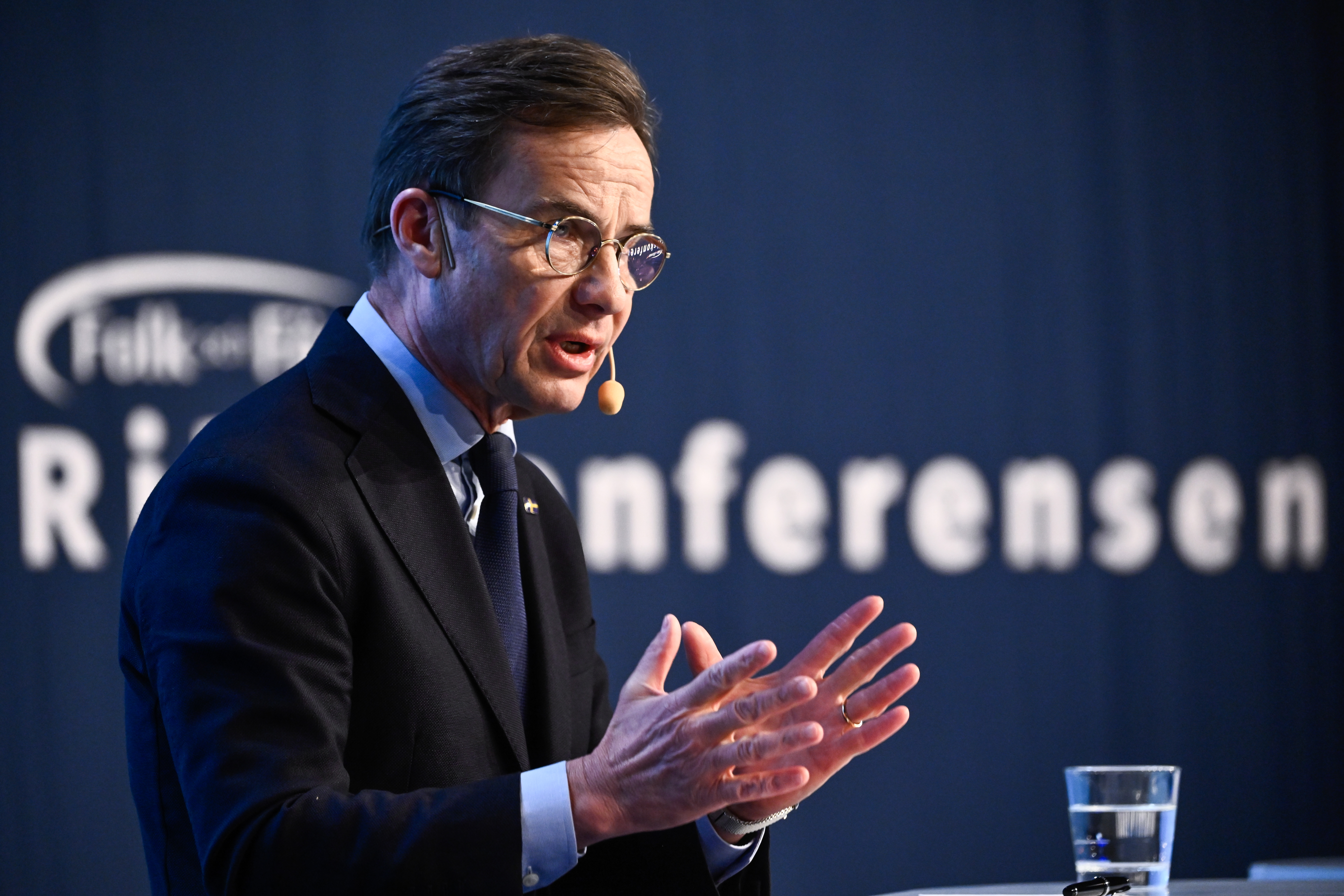 Statsminister Ulf Kristersson (M) på en pressträff under Folk och Försvar i Sälen.