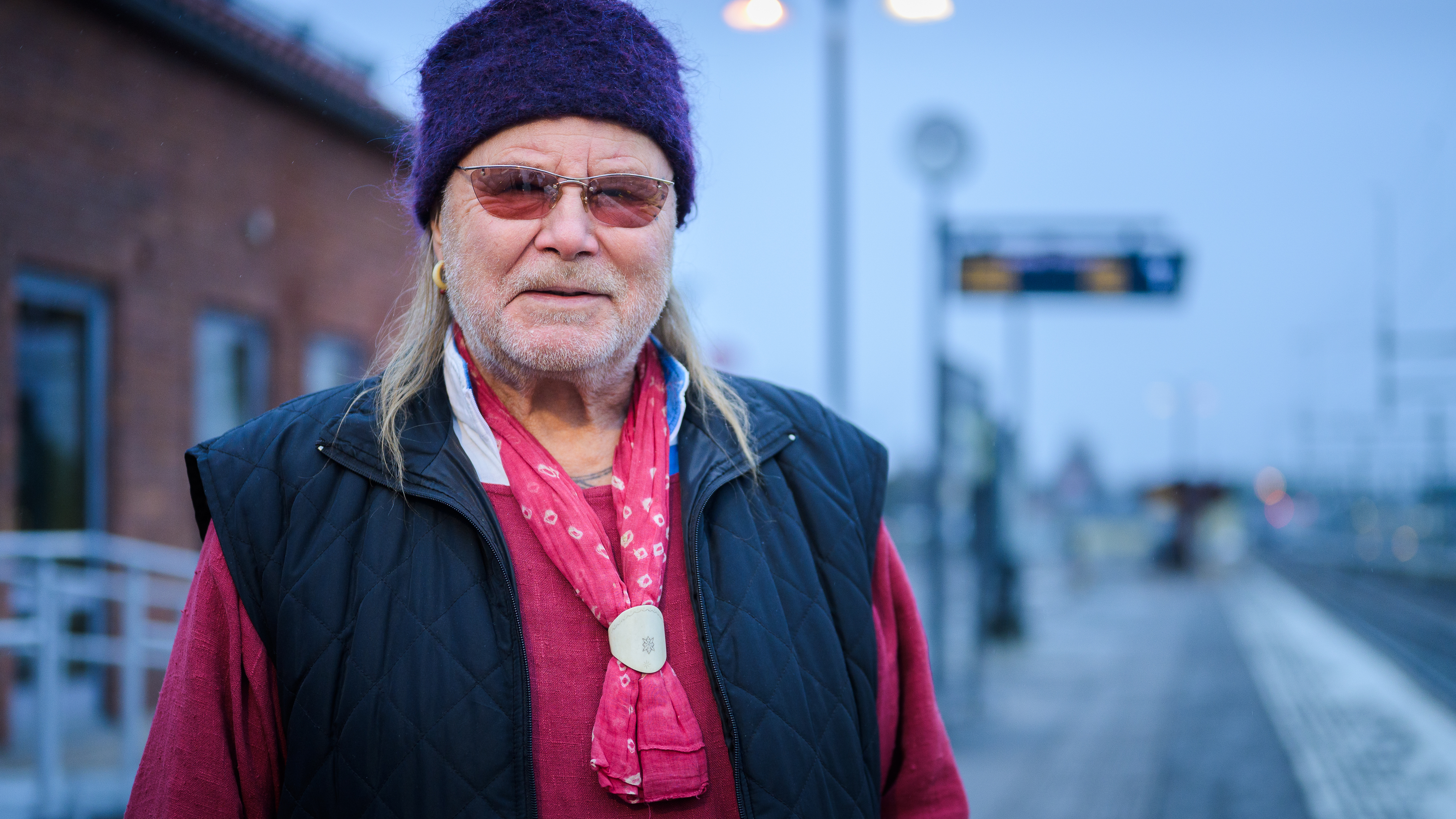 På Ljusdals tågstation tittar man nyfiket, trots att artistens klädsel för dagen är ovanligt diskret: Jeans, curlingskor. Men också rosa glasögon (slipade i hans styrka) och en lila tovad ullhatt.