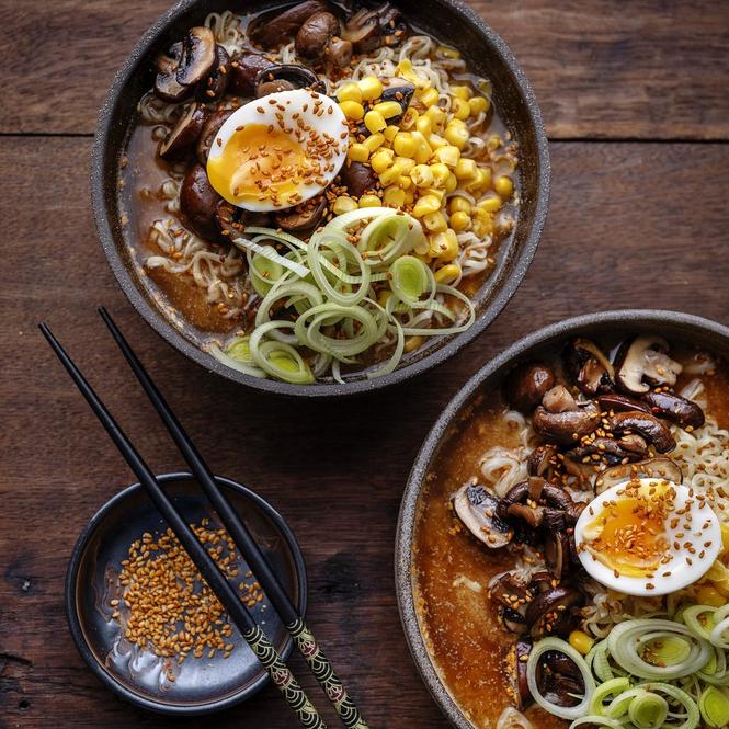 En matig och mättande japansk nudelsoppa med grönsaker. Här använder Maria Zihammou en svampbuljong som hon smaksätter med miso och sesampasta. Kombinationen blir riktigt umamistinn och passar perfekt till söta majskorn, svamp och purjolök.