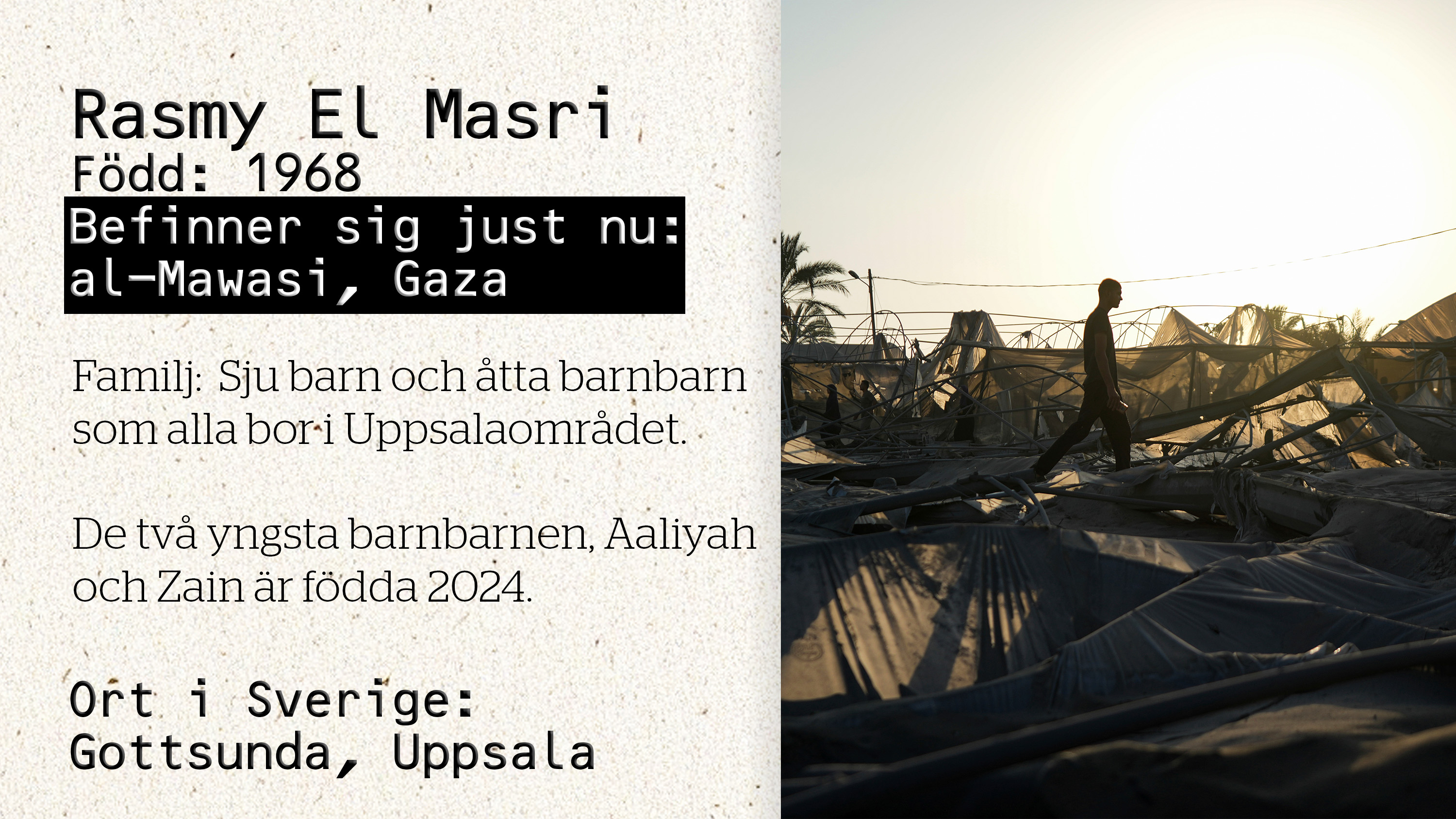 Rasmy El Masri reste in i Gaza för att hälsa på sin släkt, inklusive en sjuk syster, den 5 oktober 2023. Två dagar senare bröt kriget ut och sedan dess har han varit fast. Rasmy El Masri har bott i Sverige sedan 1987 och har barn och flera barnbarn i Uppsala. Han har hittills aldrig varit med på UD:s evakueringslistor.