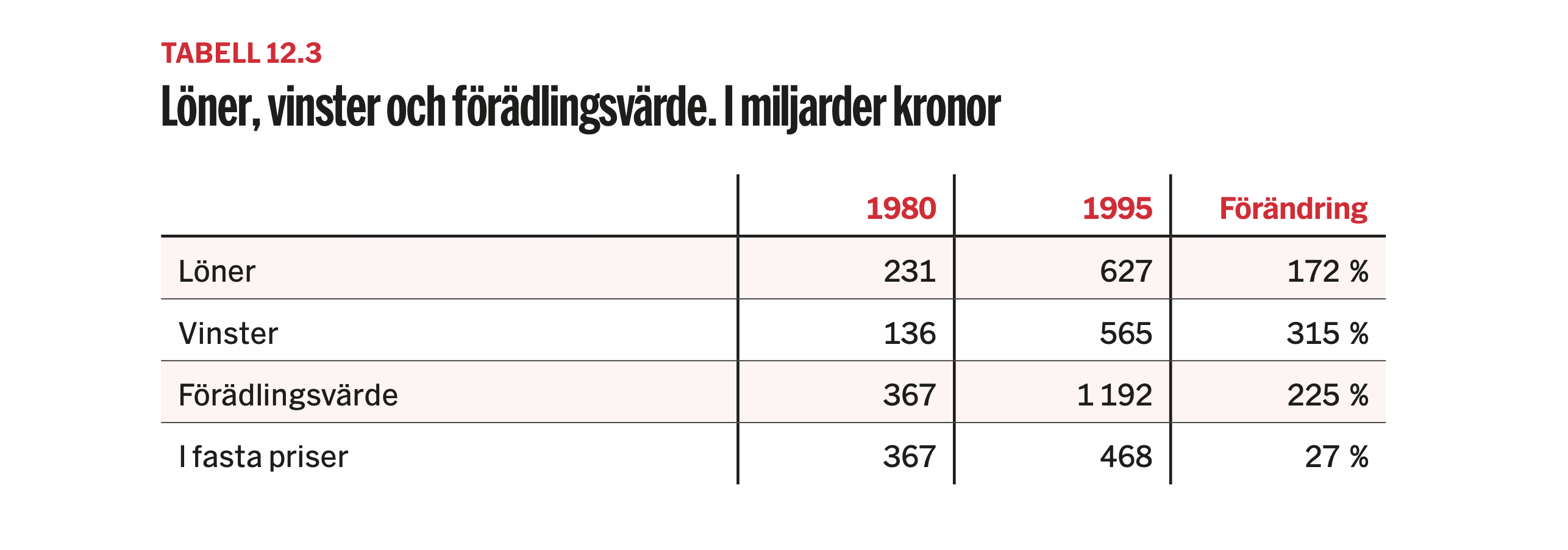 I tabellen visas de två delar som värdet av näringslivets produktion (det kallas förädlingsvärde) delas upp i – löner och vinster. Mellan 1980 och 1995 ökade lönekostnaderna i näringslivet med 172 procent. Samtidigt ökade näringslivets bruttovinst med 315 procent. Förädlingsvärdet ökade i löpande priser med 225 procent. Men mängden varor och tjänster, mätta i fasta priser, ökade bara med 27 procent.